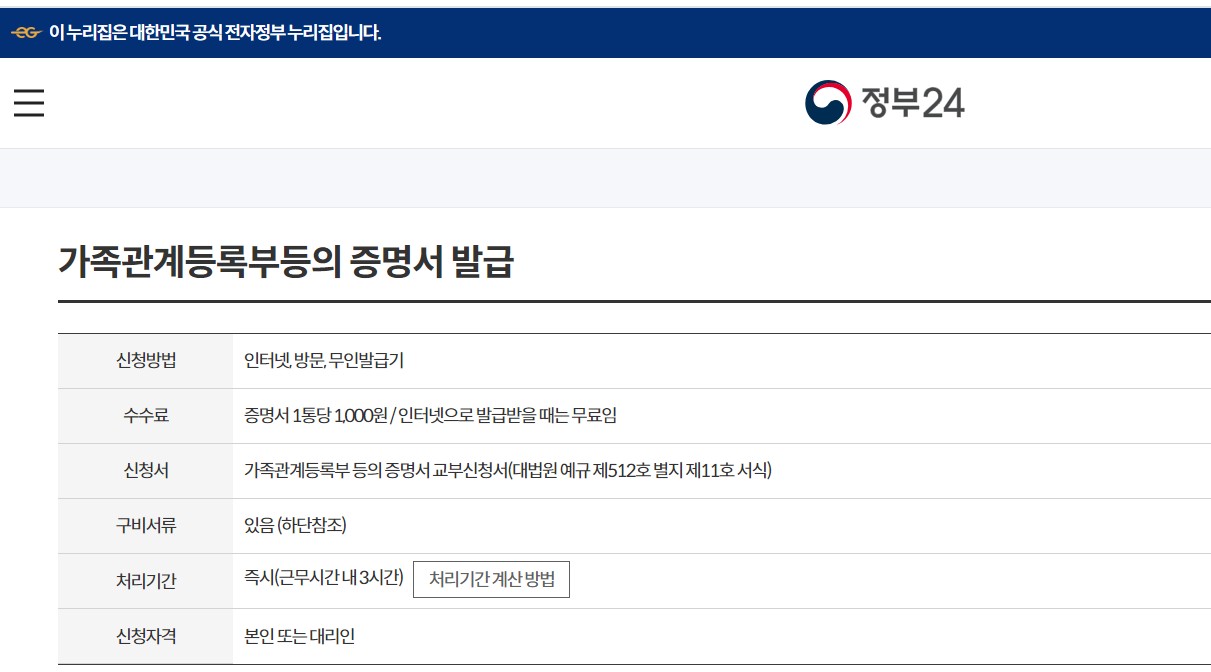 정부24에서 조회시 대법원 전자가족관계등록시스템으로 연결됩니다