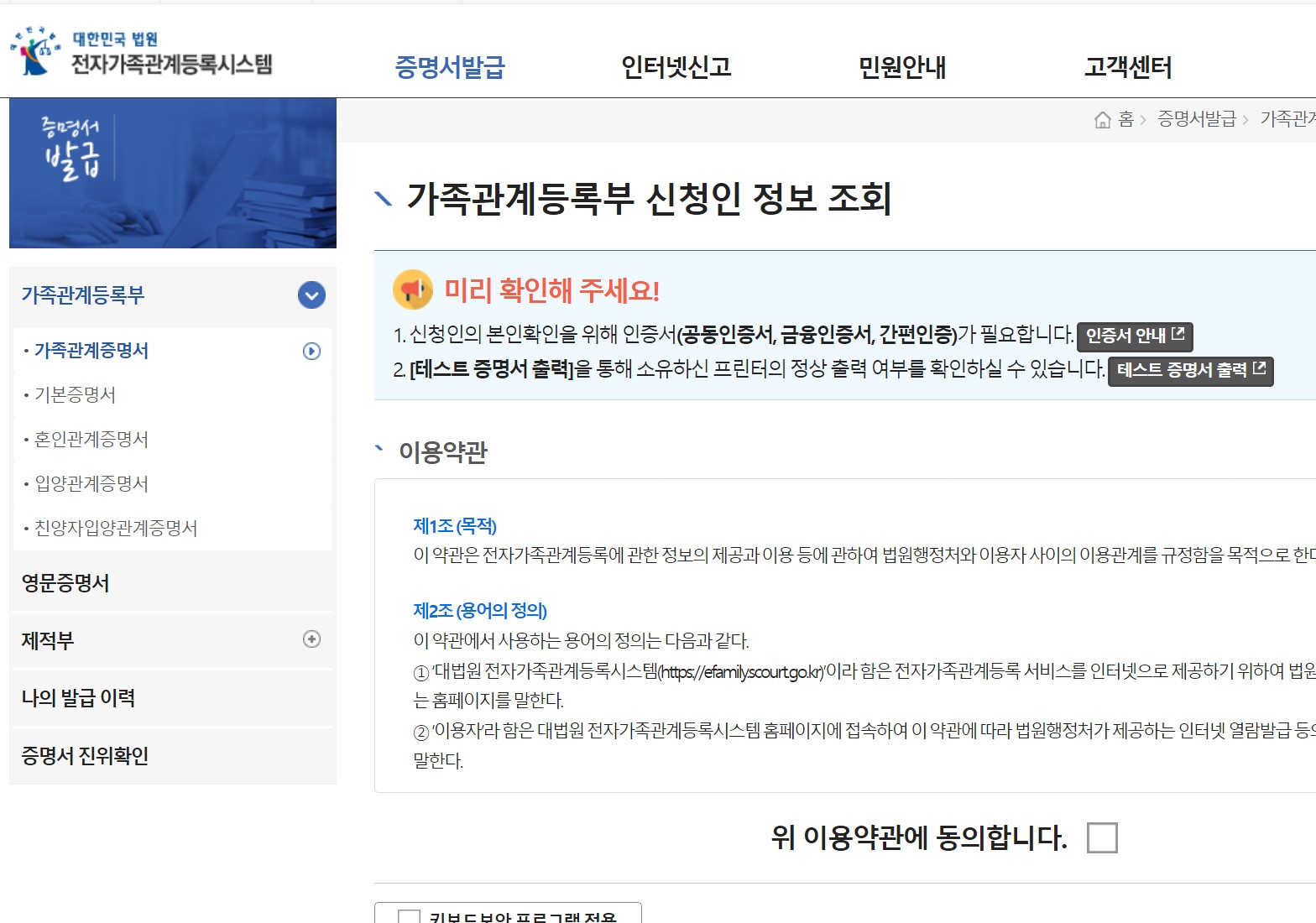 가족관계등록부 신청인 정보 조회 이용안내 미리 확인해 주세요! 1. 신청인의 본인확인을 위해 인증서(공동인증서, 금융인증서, 간편인증)가 필요합니다. 인증서 안내 2. [테스트 증명서 출력]을