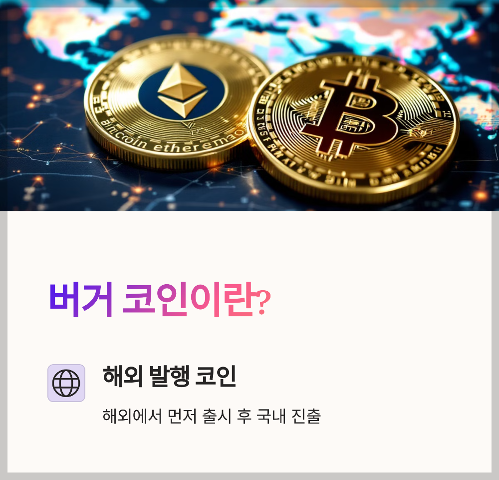 정의: 버거 코인은 해외에서 발행된 암호화폐를 뜻합니다. 주로 해외에서 프로젝트가 시작되어 해외 거래소에 먼저 상장된 후, 이후 국내 거래소에 추가로 상장되는 코인들을 일컫습니다.