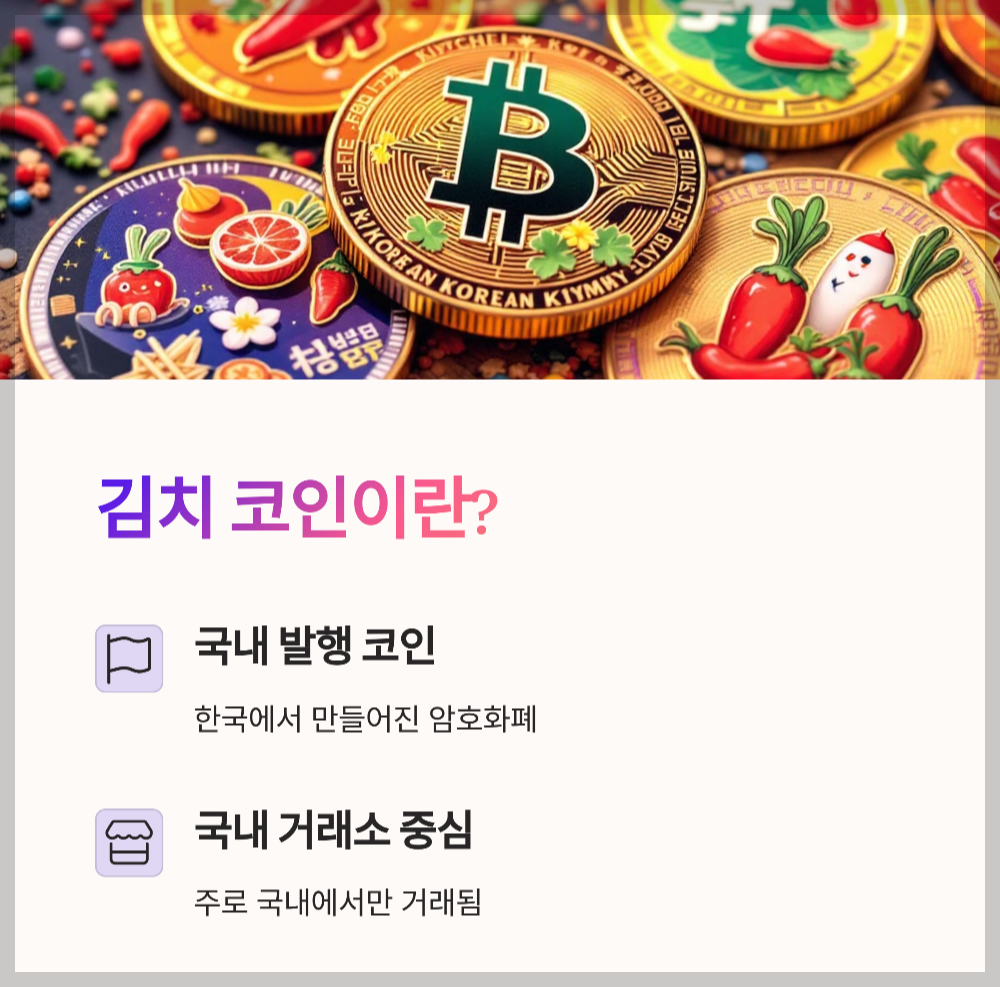 정의: 김치 코인은 국내에서 발행되었거나 국내 거래소에서만 주로 거래되는 암호화폐입니다. 프로젝트가 국내 중심으로 운영되고 해외 거래소에는 거의 상장되지 않은 경우가 많습니다.