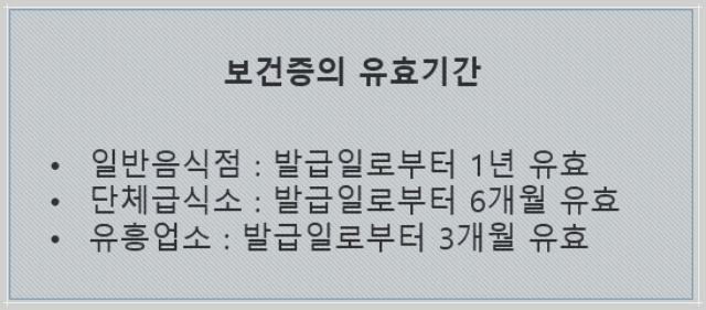 일반 요식업 1년/ 학교 급식 관계자 -6개월/ 유흥업 종사자: 3~6개얼 보건증 발급방법: 은 온. 오프라인으로 발급이 가능합니다.