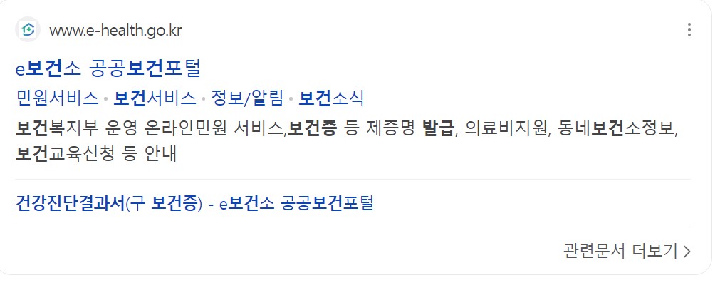 인터넷 검색창에 [보건증 인터넷 발급]을 검색하시면 공공보건포털 사이트가 나옵니다.