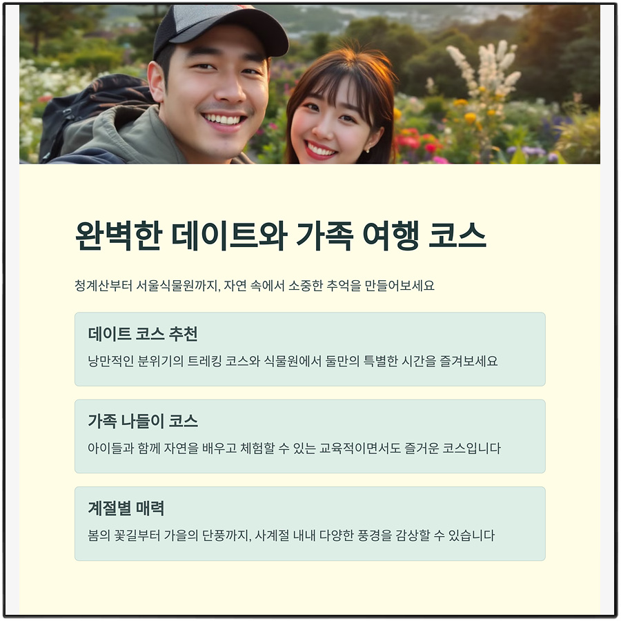 여기서 꼭 함께 들러야 할 곳이 바로 푸른수목원</strong이에요. 서울 최초의 시립 수목원으로, 다양한 식물과 넓은 잔디밭, 온실과 전시관이 잘 조성돼 있어서 산책하며 시간 보내기 딱 좋아요. 특히 가족 단위 방문객들에게 인기 만점! 👨👩👧👦
