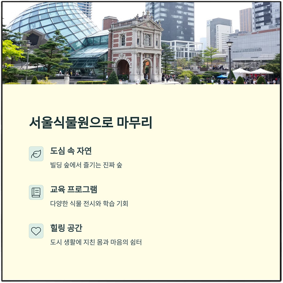 하루 종일 자연을 따라 걷고, 힐링하며 마지막 코스로 추천하는 곳은 바로 서울식물원이에요. 서울 강서구 마곡지구에 위치한 이곳은 식물, 예술, 건축이 결합된 복합 문화 공간으로, 볼거리도 많고 사진도 진짜 예쁘게 나와요 🌿
