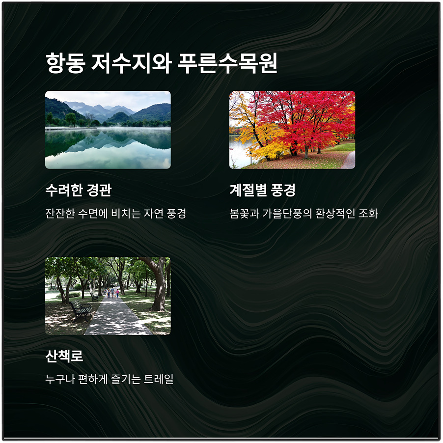 항동 저수지 주변으로는 평탄한 산책길이 조성되어 있어서, 운동화만 신고도 누구나 걷기 좋아요. 곳곳에 포토존도 많고, 물 위를 따라 걷는 듯한 ‘데크로드’ 구간은 마치 숲 속 동화나라에 온 느낌이에요 🍀
