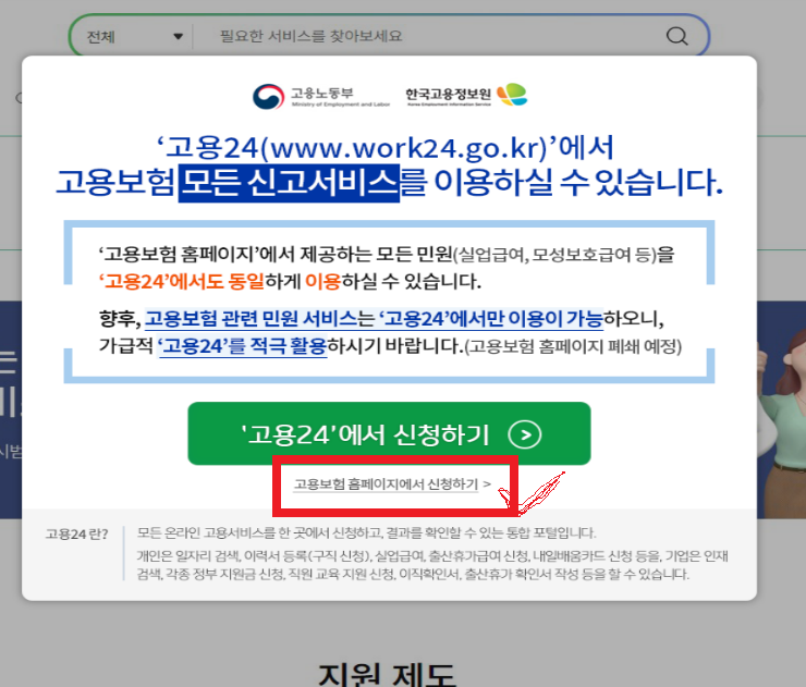 홈페이지 확인시 고용24 사이트에서도 가능하다는 팝업이 뜨지만, 그대로 고용보험 홈페이지 이용하기 하셔도 됩니다.