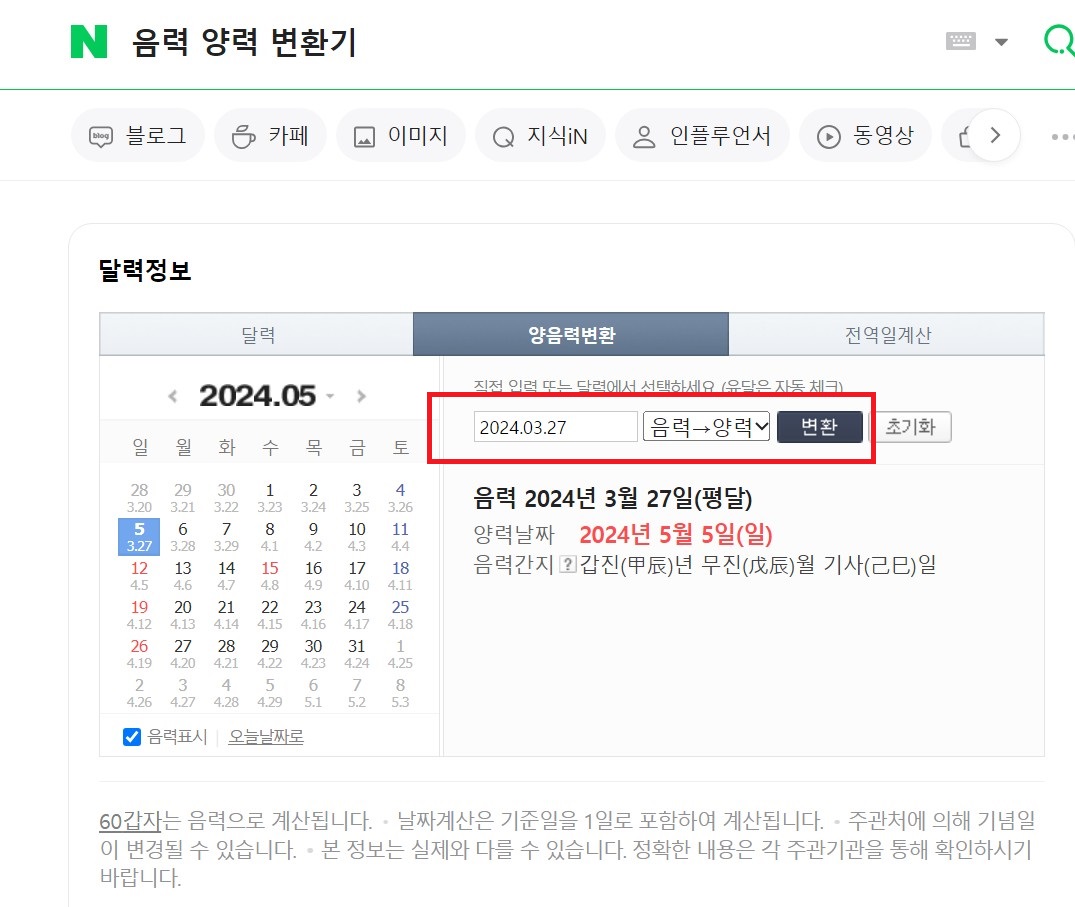 네이버에 들어가서 [음력 양력 변환] 혹은 [음력 양력] 이라고만 쳐도 간단하게 변환할 수 있는 화면이 나옵니다.