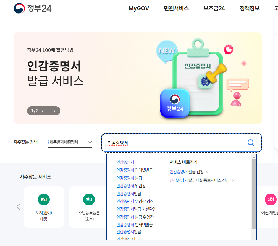 로그인 후, 검색창에 "인감증명서 발급"을 입력하고 해당 서비스 페이지로 이동합니다.