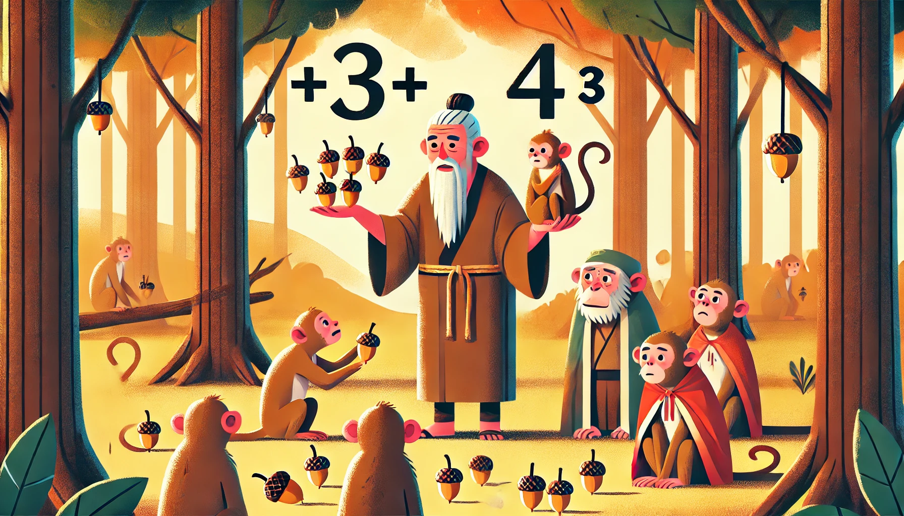 옛날 한 사람이 원숭이를 길렀는데, 먹이를 줄 때 문제를 해결하려고 꾀를 부렸어요. 주인이 원숭이들에게 "아침에 도토리 세 개, 저녁에 네 개를 줄게"라고 했더니 원숭이들이 화를 냈습니다. 그러자 그는 말을 바꾸어 "그럼 아침에 네 개, 저녁에 세 개를 줄게"라고 했죠. 그러자 원숭이들이 기뻐하며 만족했다고 해요. 사실 도토리의 총량은 변하지 않았지만, 말의 방식 하나로 상황이 달라진 거죠.
