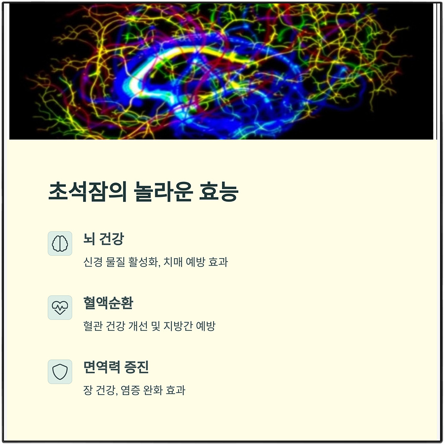 초석잠에는 콜린(Choline)과 페닐에타노이드 같은 성분이 풍부하게 들어 있어요. 이 성분들은 뇌세포의 신경 전달 기능을 활성화해주고, 기억력 개선과 인지 능력 저하를 막는 데 도움을 줍니다.