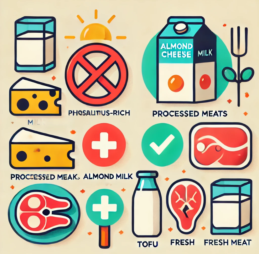 유제품이나 가공식품에 포함된 인의 함량을 줄이는 것도 중요합니다. 인이 적게 들어간 대체 식품을 선택해 뼈와 신장을 보호하세요.