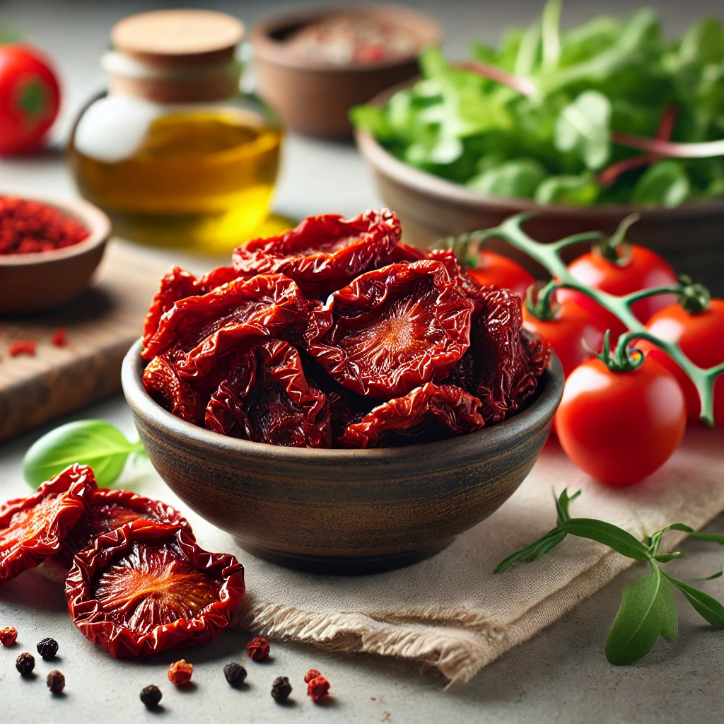 건조된 토마토는 껍질의 영양소가 농축되어 간식으로 먹기 좋습니다. 샐러드 토핑이나 파스타 재료로 활용하기에도 적합하며, 건강한 스낵으로도 좋습니다.