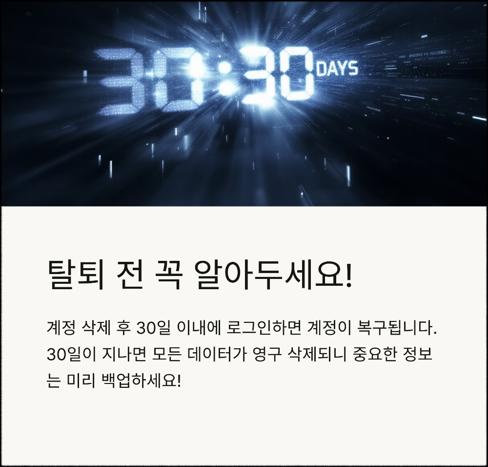 탈퇴 후 30일 동안은 재로그인을 통해 계정 복구가 가능합니다. 그러나 30일이 지나면 모든 정보가 삭제되어 복구가 불가능하니 탈퇴 전 반드시 확인하세요.
